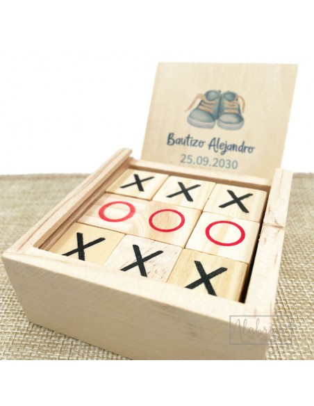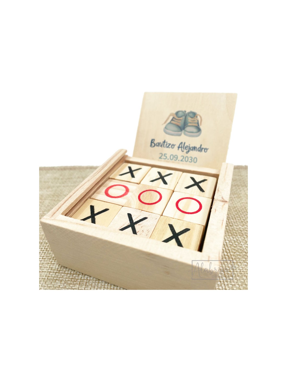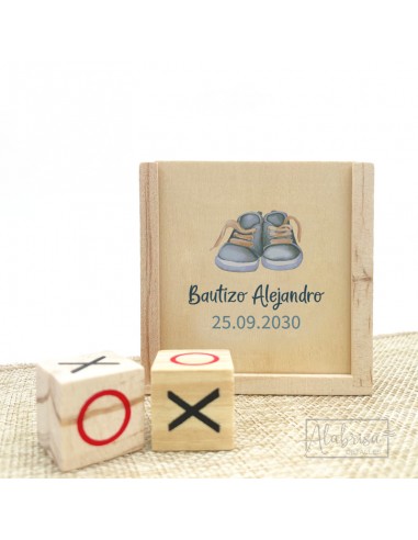 Tic tac toe o Tres en raya fabricado en madera y formato para llevar, personalízalo con un bonito diseño de dos zapatitos de niño o niña en tonos celeste. Ideal para regalar a los invitados de bautizo.