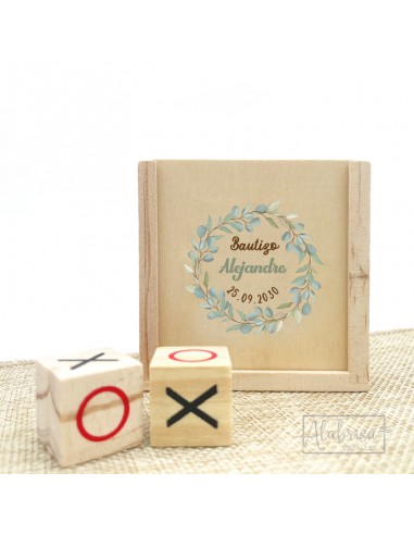 Divertido tres en raya de madera en formato bolsillo para bautizo de niño, con corona floral en tonos pastel y nombre en verde agua. Recuerdo personalizado y original que encantará a tus invitados.