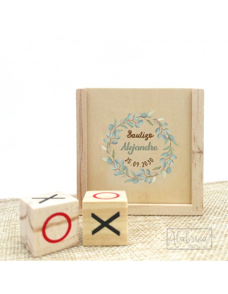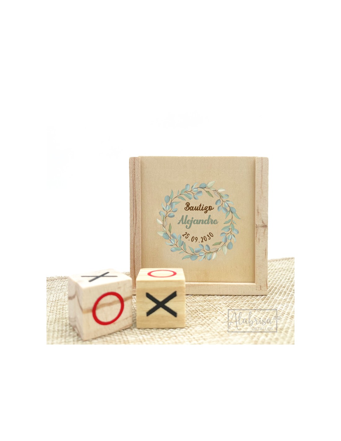 Tic tac toe portátil, fabricado en madera y listo para personalizar con un diseño floral. Un regalo práctico y divertido y un recuerdo bonito para los invitados del bautizo de niños y niñas.